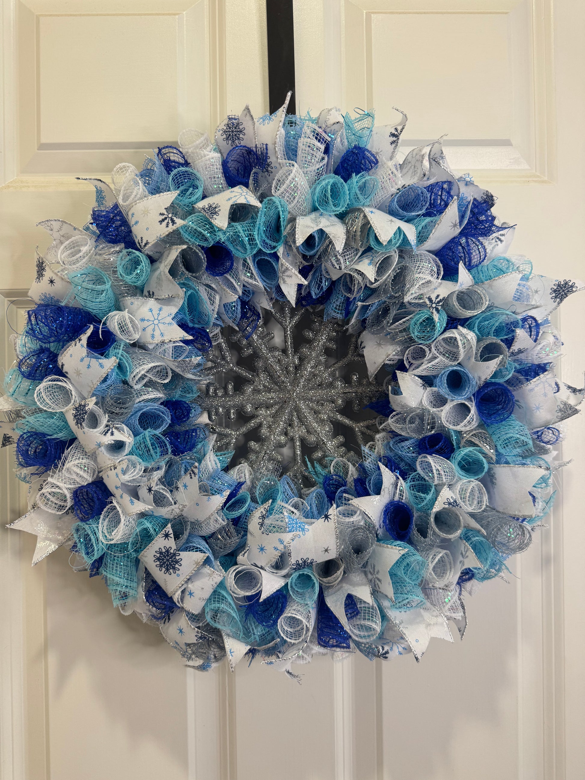This beautiful wreath has 3 different colors of blue, white and silver deco mesh. With a beautiful winter snowflake ribbon as well as a silver snowflake in the center!